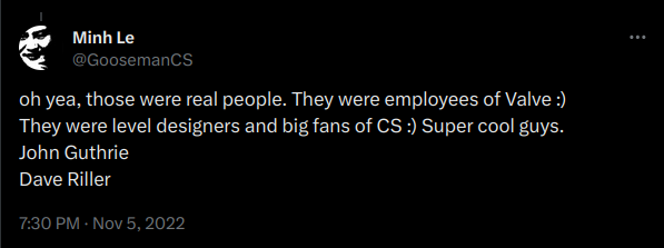 На знаменитом фоне в качестве моделей были сняты два сотрудника Valve - Джон Гутри (John Guthrie) и Дейв Риллер (Dave Riller). Оба были левел-дизайнерами и работали над CS того времени. Это подтвердил и сам Мин Ли в своём твиттере в 2022 году: