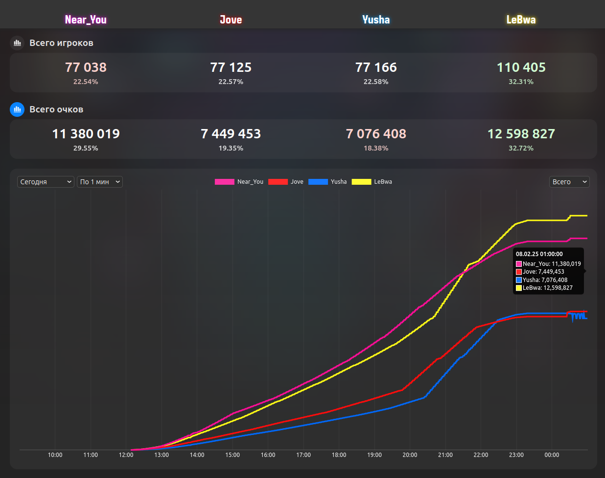 - В первый час битвы лидировал LeBwa, но затем Near_You обогнал его и держал первентсво почти весь день.