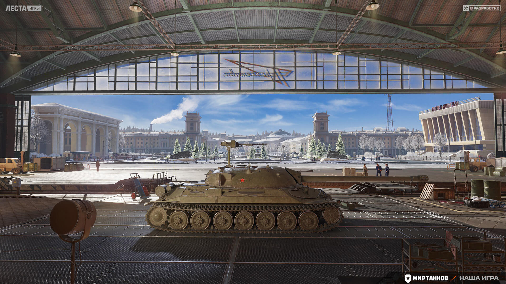 На скриншотах заметно, что зимняя тематика подчёркивает монументальность окружающих зданий. Крыша ангара пропускает свет, освещая детали танков. Внутри много мелких элементов: от тележек и грузов до декоративных панно со звёздами и фигурой танкистов. Всё это создаёт ощущение оживлённого исторического вокзала, приспособленного под военную мастерскую.