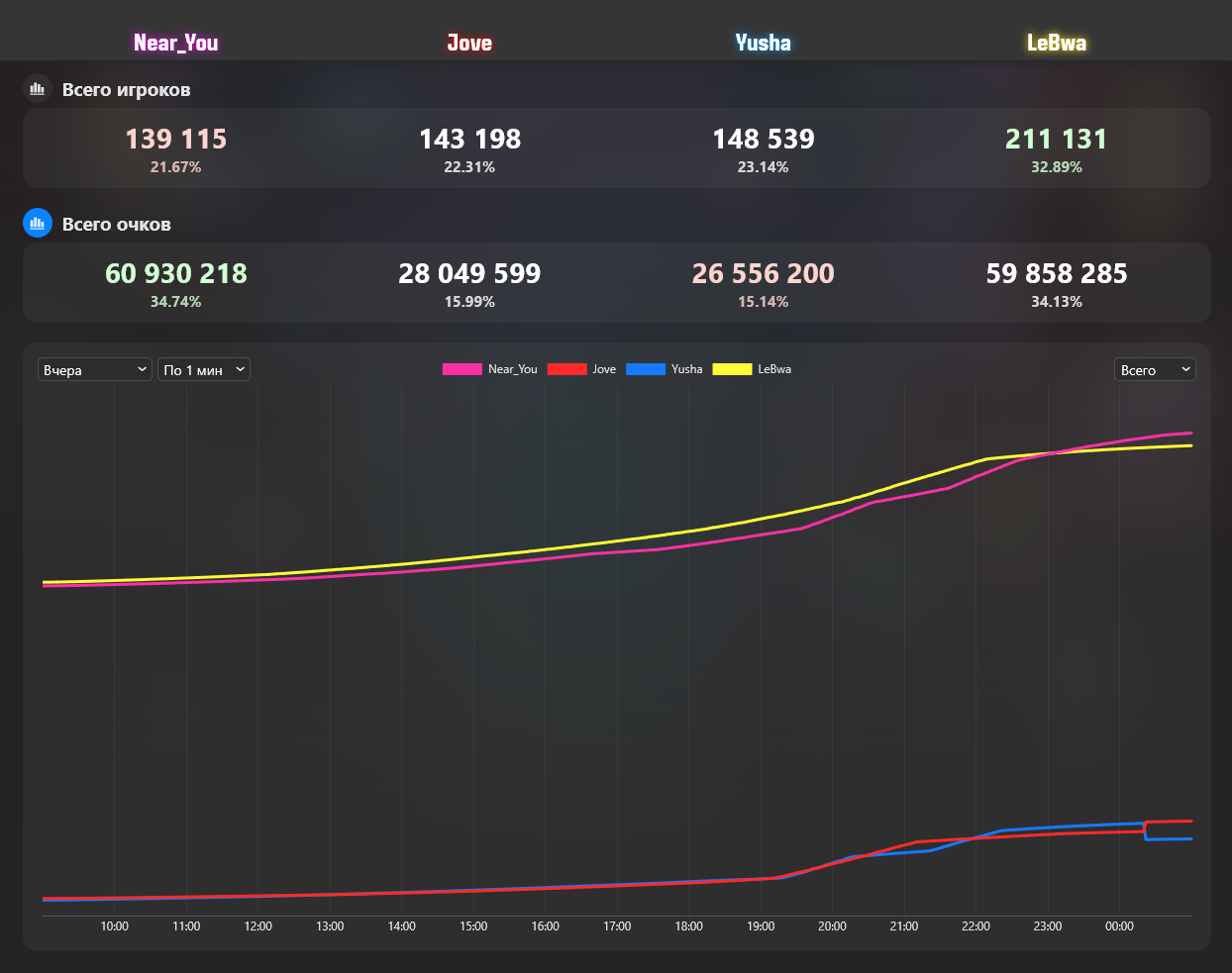 Near_You вырвал победу дня у Левши под вечер. Команда последнего отыграть очки не смогла, но отрыв на данный момент составляет около 1млн очков, что в рамках события - сущие копейки.