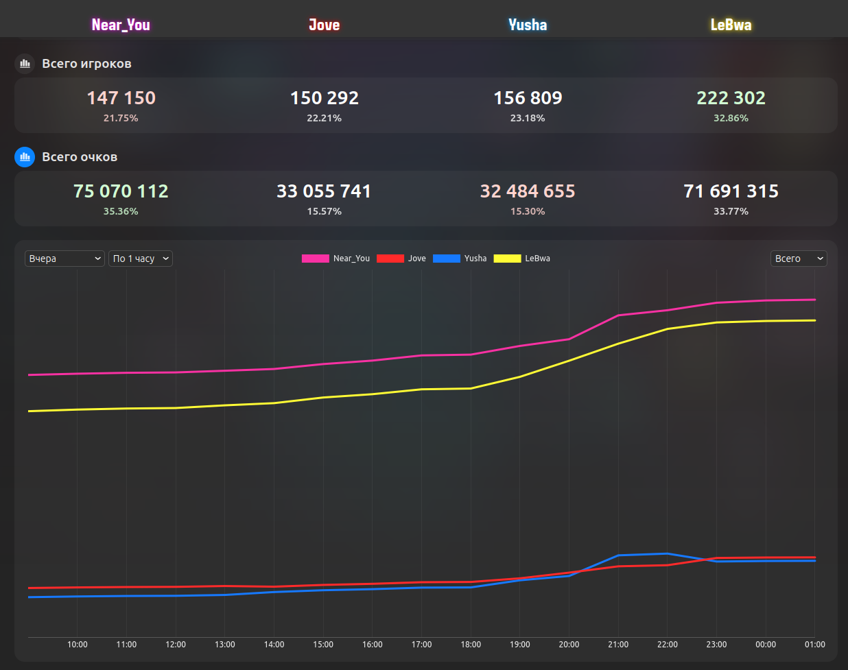 | 2 | LeBwa | 222 302 | 70 173 018 | 315,67 | 51.93% |
