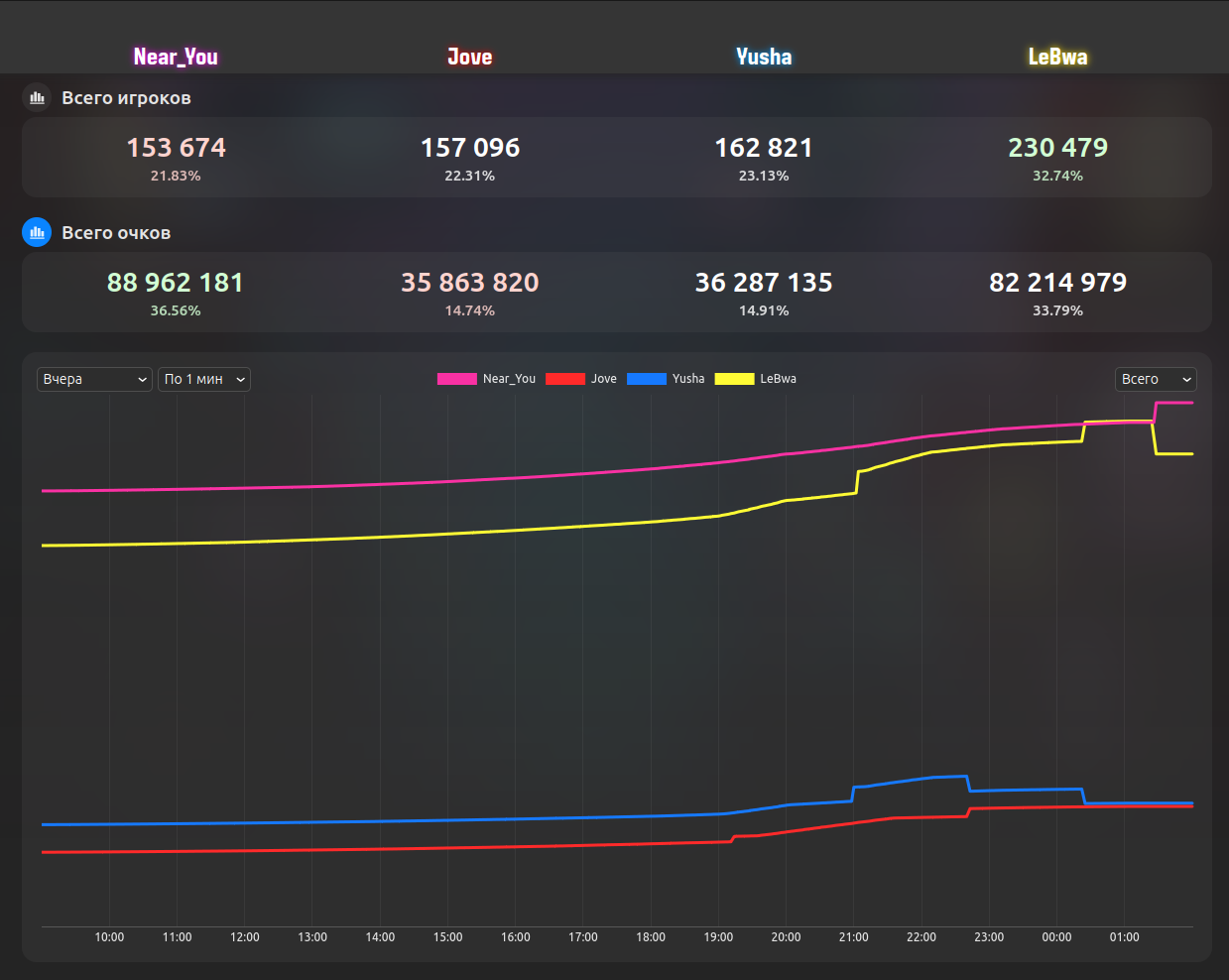 - Near_You напал на Левшу и увеличил разрыв между ними на 6.7 млн очков!